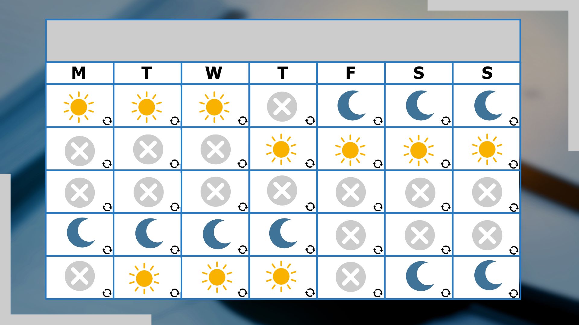Välj ett skiftmönster (2-skiftsveckoschema, 3-skiftsschema, nattskift etc...) och följ stegen nedan för att enkelt skapa och hantera ett roterande skiftschema med PlanningPME.